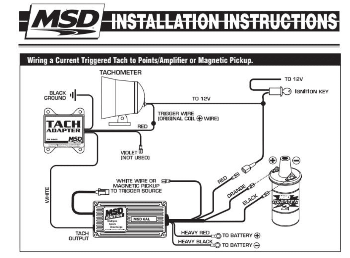 As far as tachometers are concerned, if you have a modern aftermarket “voltage triggered” style tachometer, you can hook it up as per the instructions included with the tachometer. Typically there is a 12v switched wire that provides power to the tach, a ground wire, and a trigger wire that gets connected to the “-” terminal of the ignition coil. You can also use the “tach” output on the MSD 6AL box to trigger the tachometer