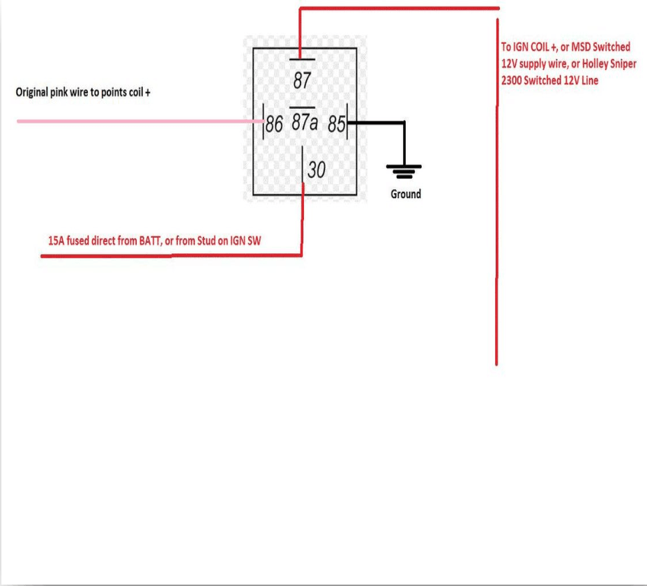 It is important to mention that converting to this setup will require you to find a wire that provides a full 12v to the coil, and the DSII module in both run, AND crank. The original points style coil ran on about 6-8v, which will not give you full potential with the aftermarket setup. There are a few ways to remedy this. One way is you can utilize your original pink + coil wire to close the contacts of a Bosch relay, that you can then wire to power the coil full 12v. The premise being, the Bosch relay will be have the “30” terminal hooked directly to the battery source, and the “87” will carry the full 12v output to the “+” of the coil. Wire the original pink + wire to the “86” contact on the relay. Wire the “85” contact to ground. A second way you can do this is to attach a new wire to the back of the stud on the ignition switch. This stud has 12V power any time the key is on. If you do this, you still have to tackle the 12V in crank issue as well. You can run a wire from the “I” terminal on the ignition solenoid, and tie it directly to the coil “+” terminal as well as the switched 12v wire from the stud described previously. This will provide 12V in both the key on, and start position. These two methods can also be used for wiring the Holley EFI and the MSD box, which both need 12V in hot and crank as well. Note that the wiring for using the MSD box is different, so make sure you are using the correct diagram! They are both shown below in the figures!